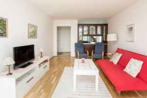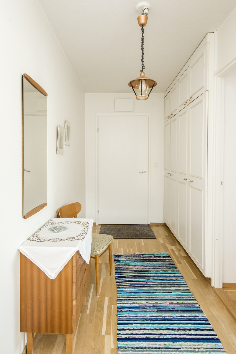 Bostaden är en genomhuslägenhet belägen i fastighetens andra och översta våning på den södra gaveln. Planlösningen är väl genomtänkt och präglas av ett fint ljusinsläpp, där köket, vardagsrummet och den inglasade balkongen ligger i anslutning till varandra. Den mer privata delen av bostaden rymmer sovrum och badrum, vilket skapar en naturlig och lugn avskildhet. I sovrummet finns dessutom ett praktiskt klädrum, som bidrar till goda förvaringsmöjligheter. Bostaden är i gott skick, badrum och ytor har renoverats under senare år.