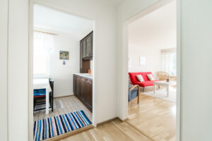 Läpitalonasunto sijaitsee toisessa ja ylimmässä kerroksessa, eteläpäädyssä. Pohjaratkaisu on hyvin suunniteltu ja valoisaksi toteutettu, keittiö, olohuone ja lasitettu parveke ovat yhteydessä toisiinsa. Asunnon yksityisempi osa käsittää makuuhuoneen ja kylpyhuoneen, mikä luo luonnollisen ja rauhallisen erillisyyden. Makuuhuoneessa on lisäksi käytännöllinen vaatehuone, joka tarjoaa hyvät säilytysmahdollisuudet. Asunto on hyvässä kunnossa, kylpyhuone ja pinnat on remontoitu viime vuosina.