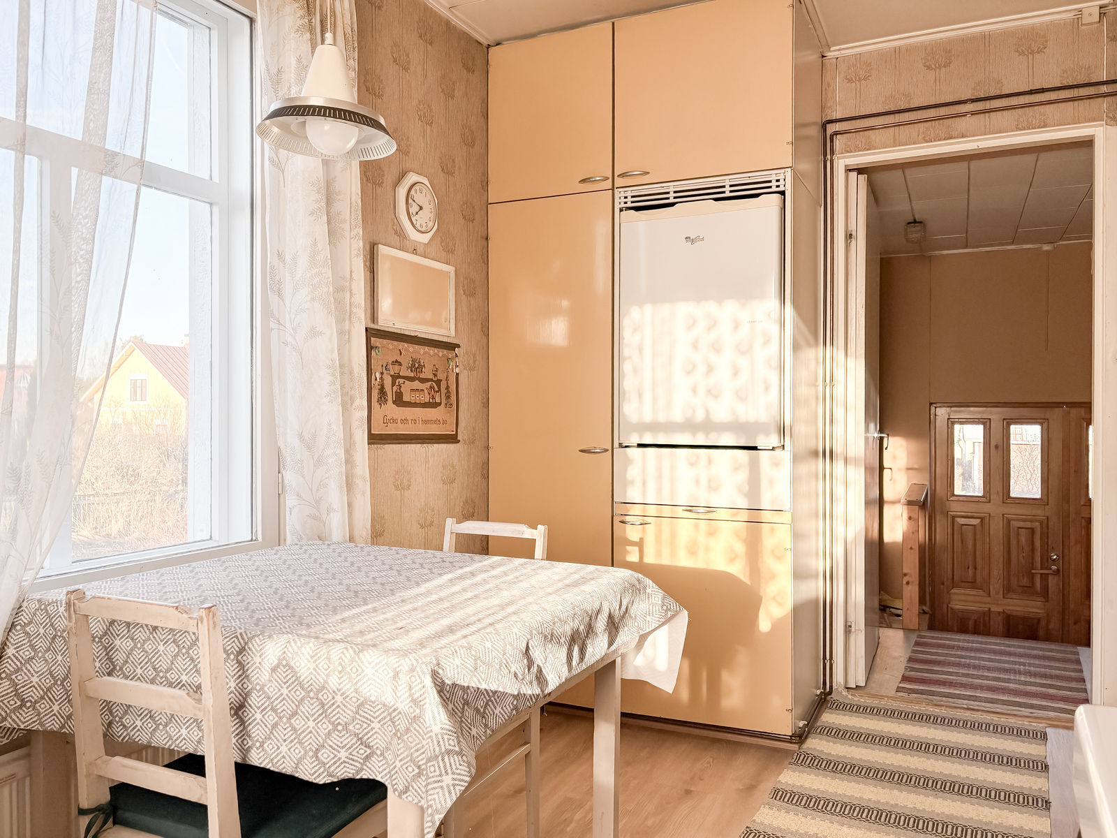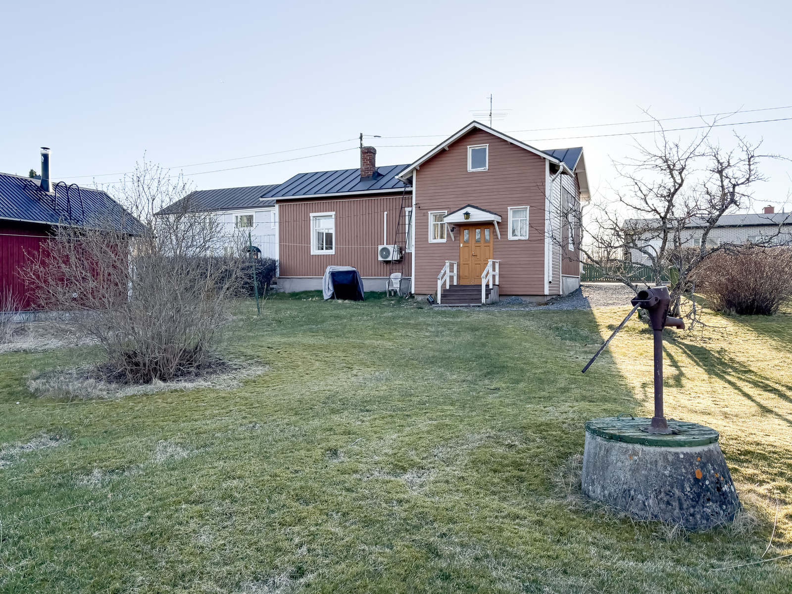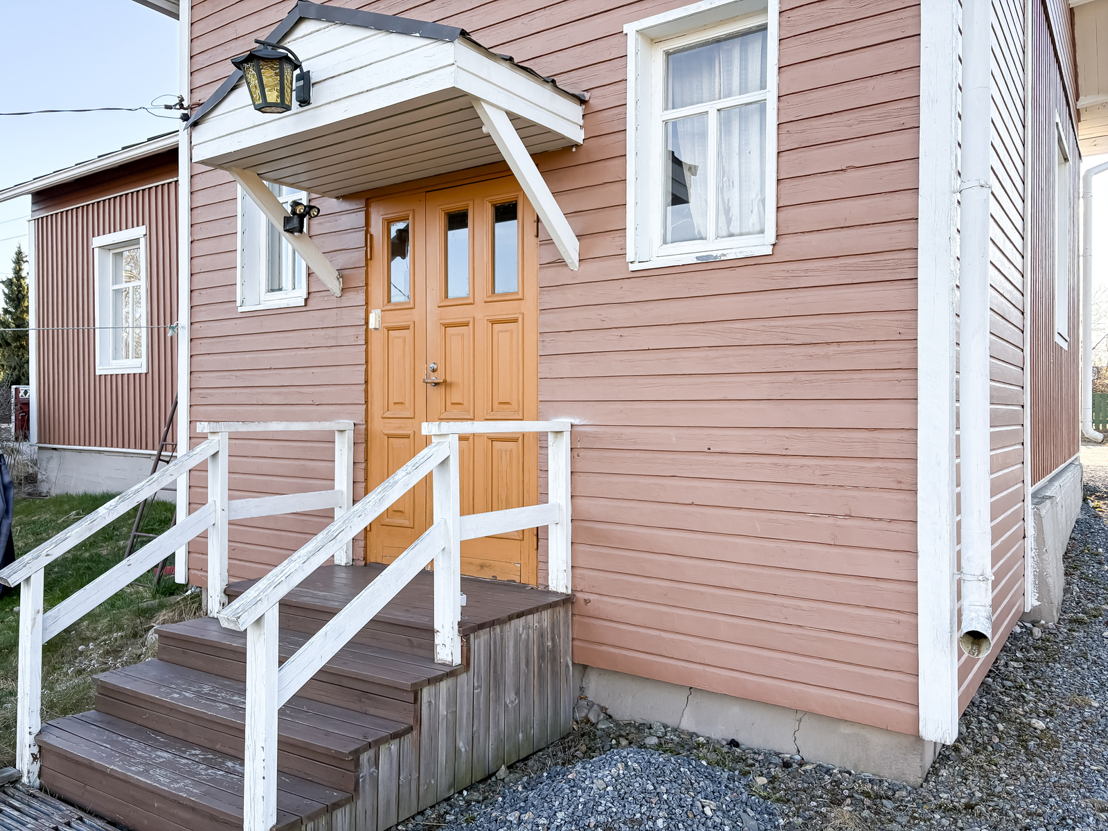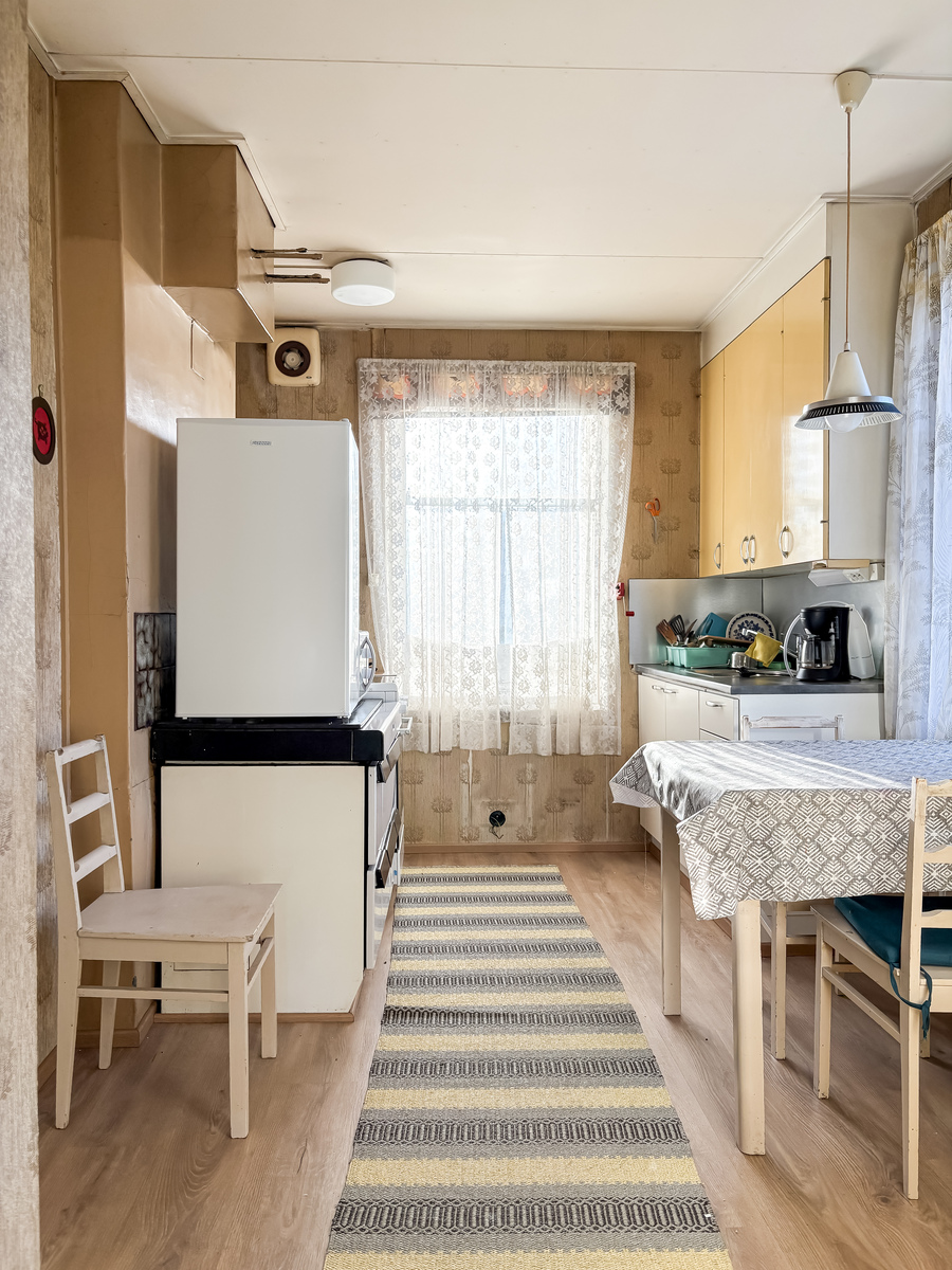 | Tehdyt korjaukset | Peruskorjaus 1972 (talotekniikka (sähköt + putket), ikkunat, peltikatto, talon laajennus (wc)). Julkisivumaalaus, ilmalämpöpumpun asentaminen, keittiön alakaapistot + taso uusittu n. 2020. Grundrenovering 1972 (husteknik (el + rör), fönster, plåttak, tillbyggnad av huset (wc)). Fasadmålning, installation av luftvärmepump samt förnyelse av kökets nedre skåp och bänkskiva ca 2020. |