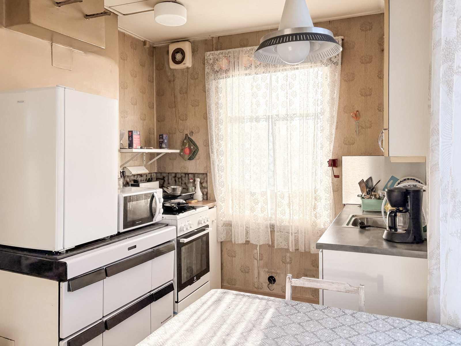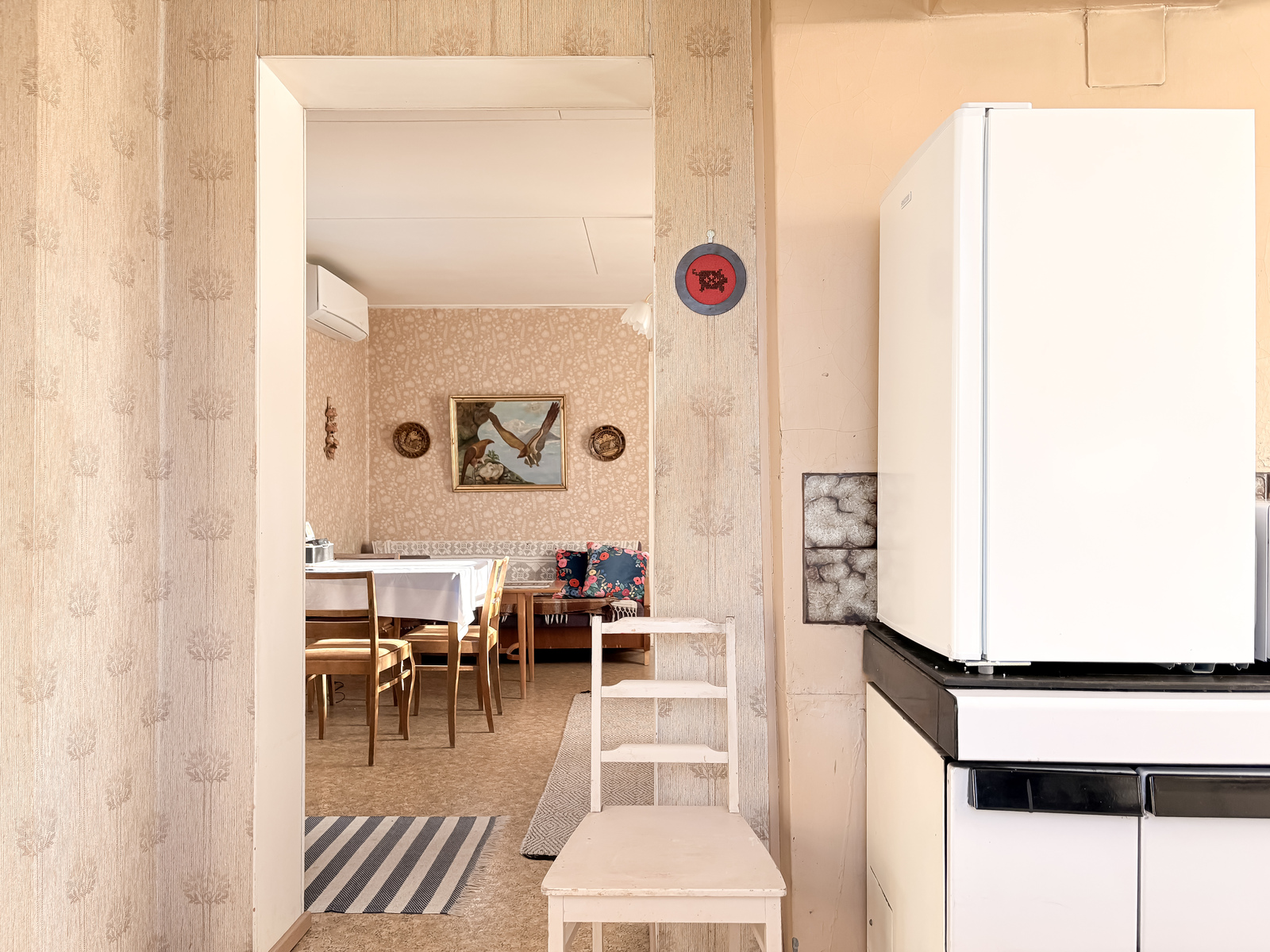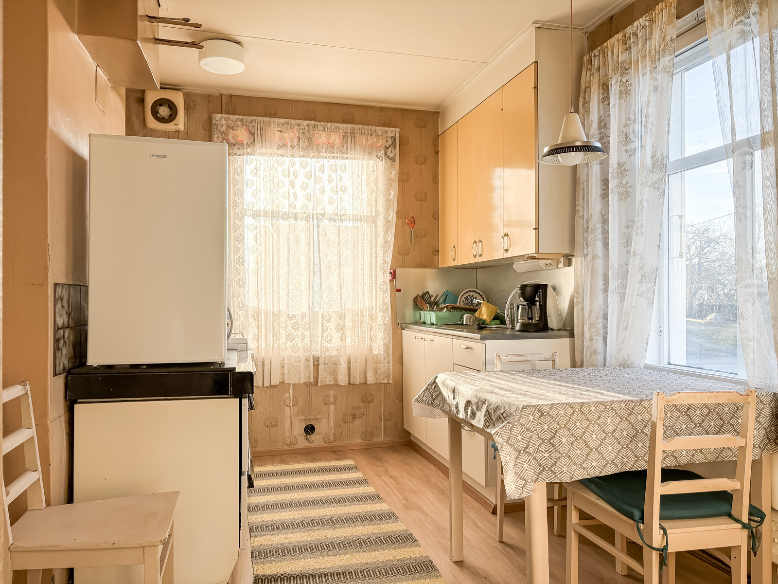 | Tehdyt korjaukset | Peruskorjaus 1972 (talotekniikka (sähköt + putket), ikkunat, peltikatto, talon laajennus (wc)). Julkisivumaalaus, ilmalämpöpumpun asentaminen, keittiön alakaapistot + taso uusittu n. 2020. Grundrenovering 1972 (husteknik (el + rör), fönster, plåttak, tillbyggnad av huset (wc)). Fasadmålning, installation av luftvärmepump samt förnyelse av kökets nedre skåp och bänkskiva ca 2020. |