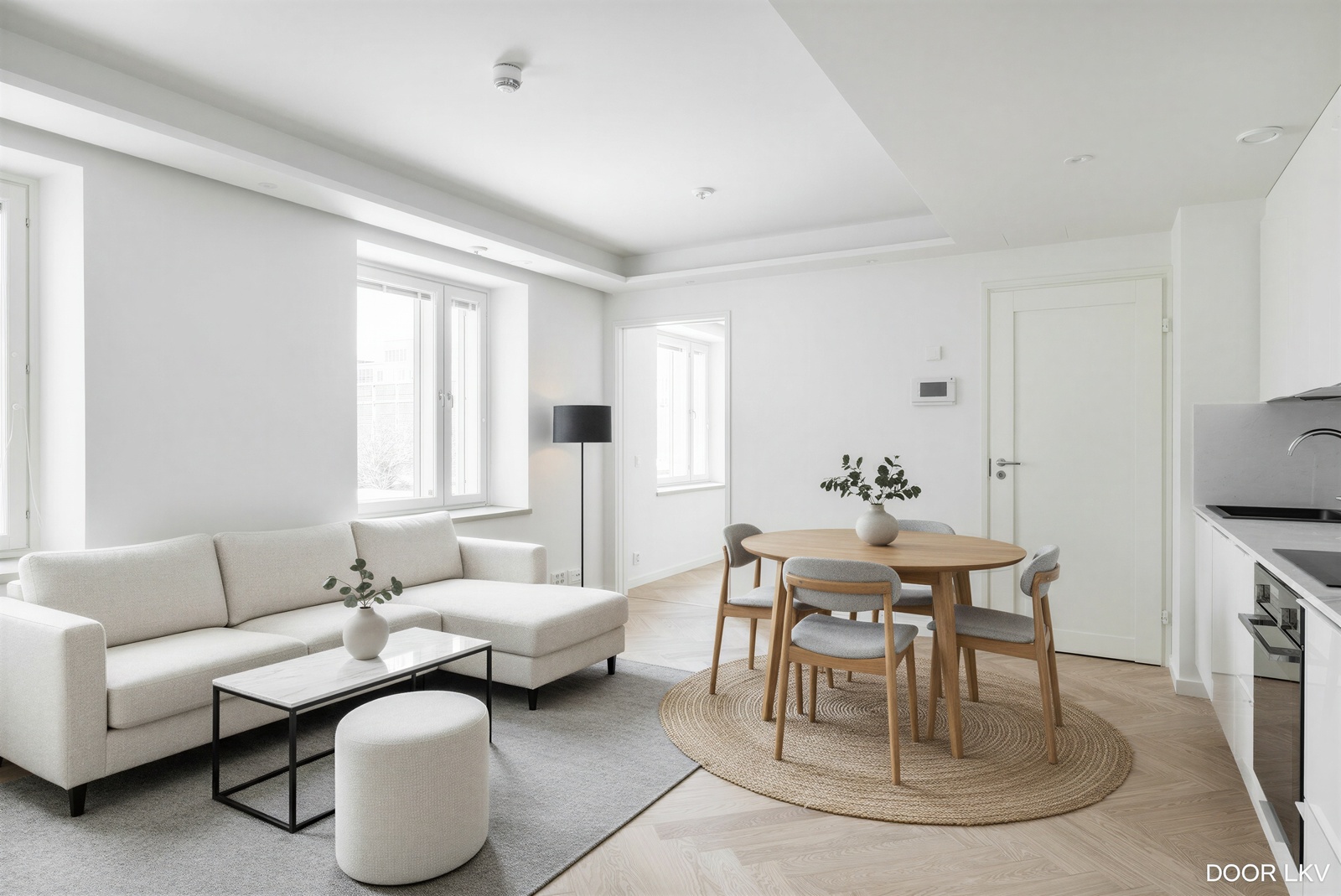 Lägenheten är en tvåa i andra våningen med fönster mot en trivsam innergård. De stora fönstren släpper in rikligt med ljus i denna moderna bostad. Vackra materialval som fiskbensparkett i ekton och köksbänkar i sten ger en stilren och hemtrevlig känsla. Badrummet är rymligt och har plats för tvättmaskin.
