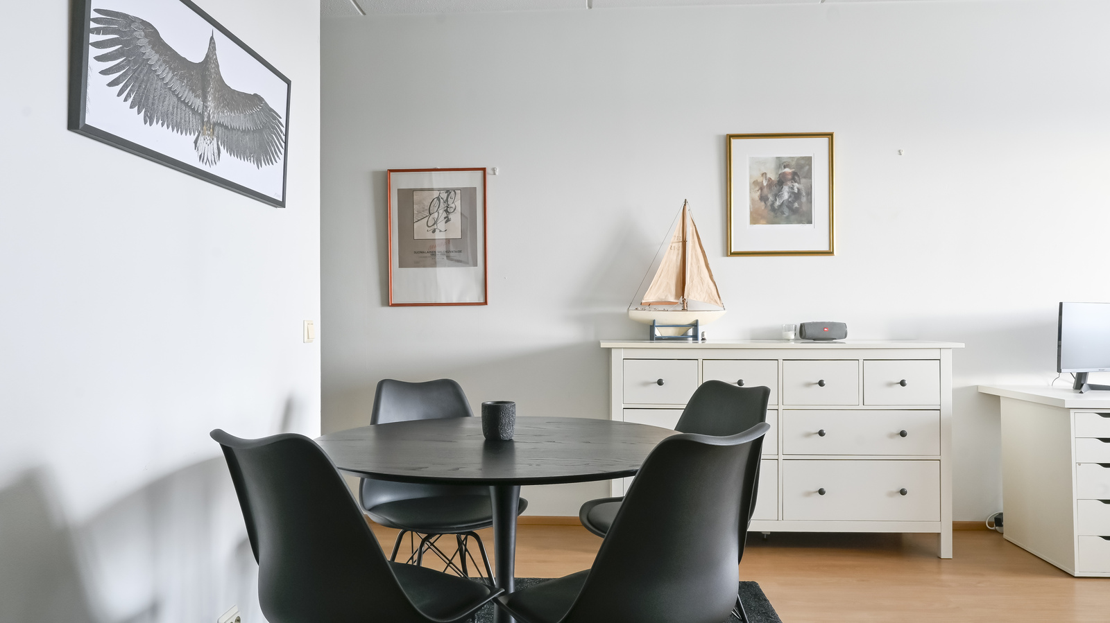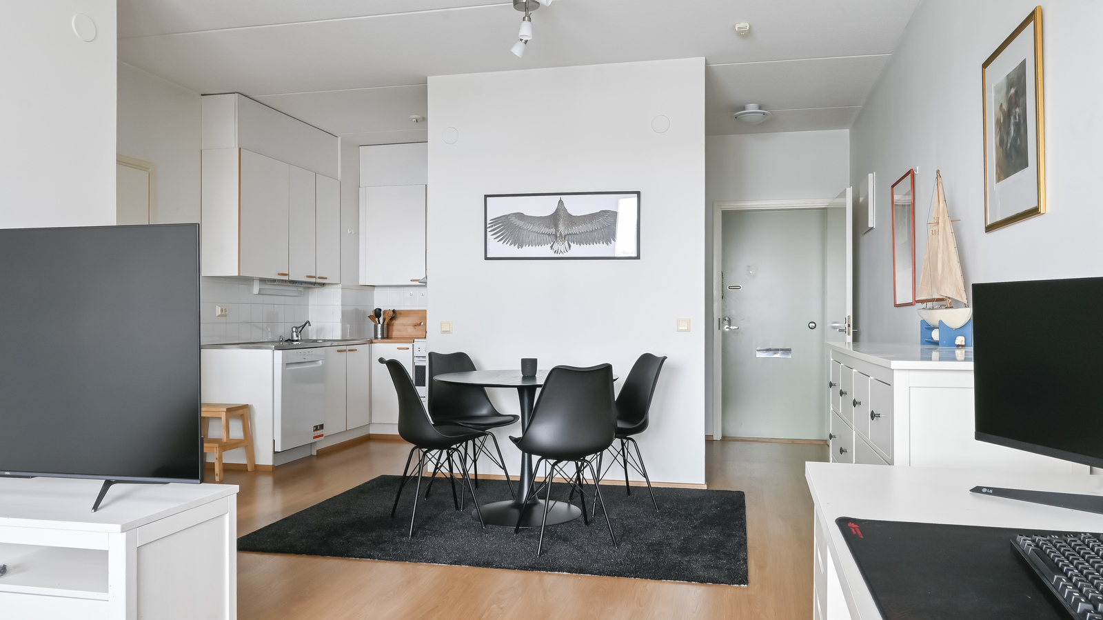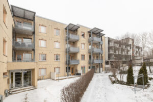 Denna tvårummare med bra planlösning med bastu är belägen på den lugna innergårdssidan och erbjuder fin utsikt över den omgivande staden. Köket smälter in med vardagsrummet, samt utgång till balkongen.