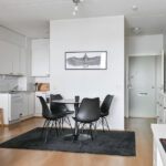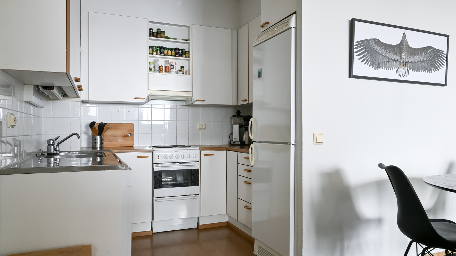 Tämä hyväpohjainen saunallinen kaksio sijaitsee rauhallisen sisäpihan puolella, tarjoten samalla upeat näkymät ympäröivään kaupunkiin. Keittiö sulautuu saumattomasti yhteen olohuoneen kanssa, josta on käynti parvekkeelle.