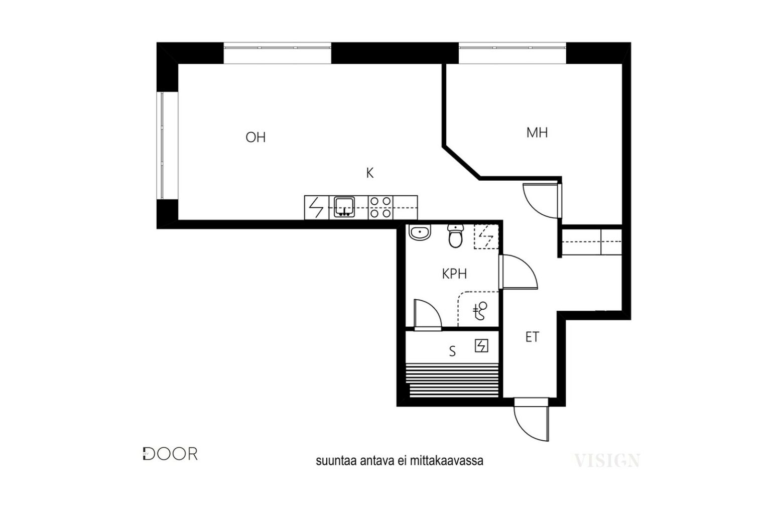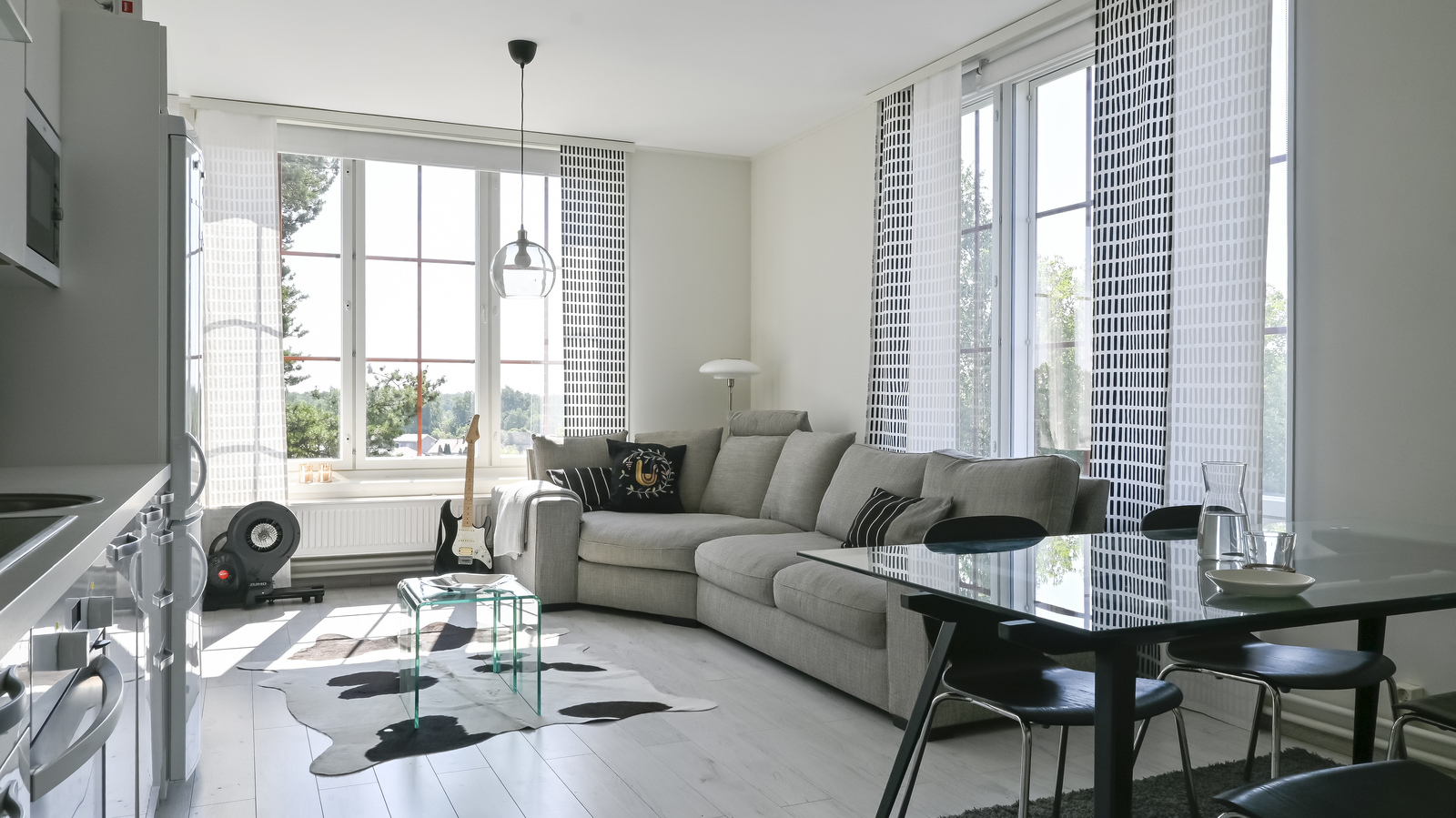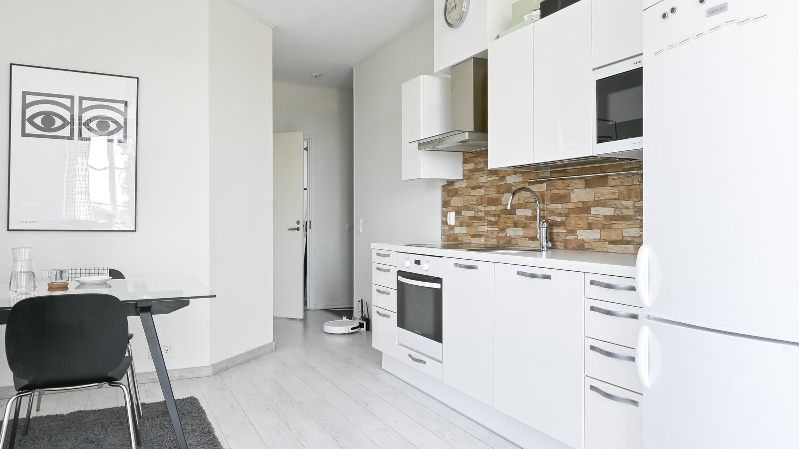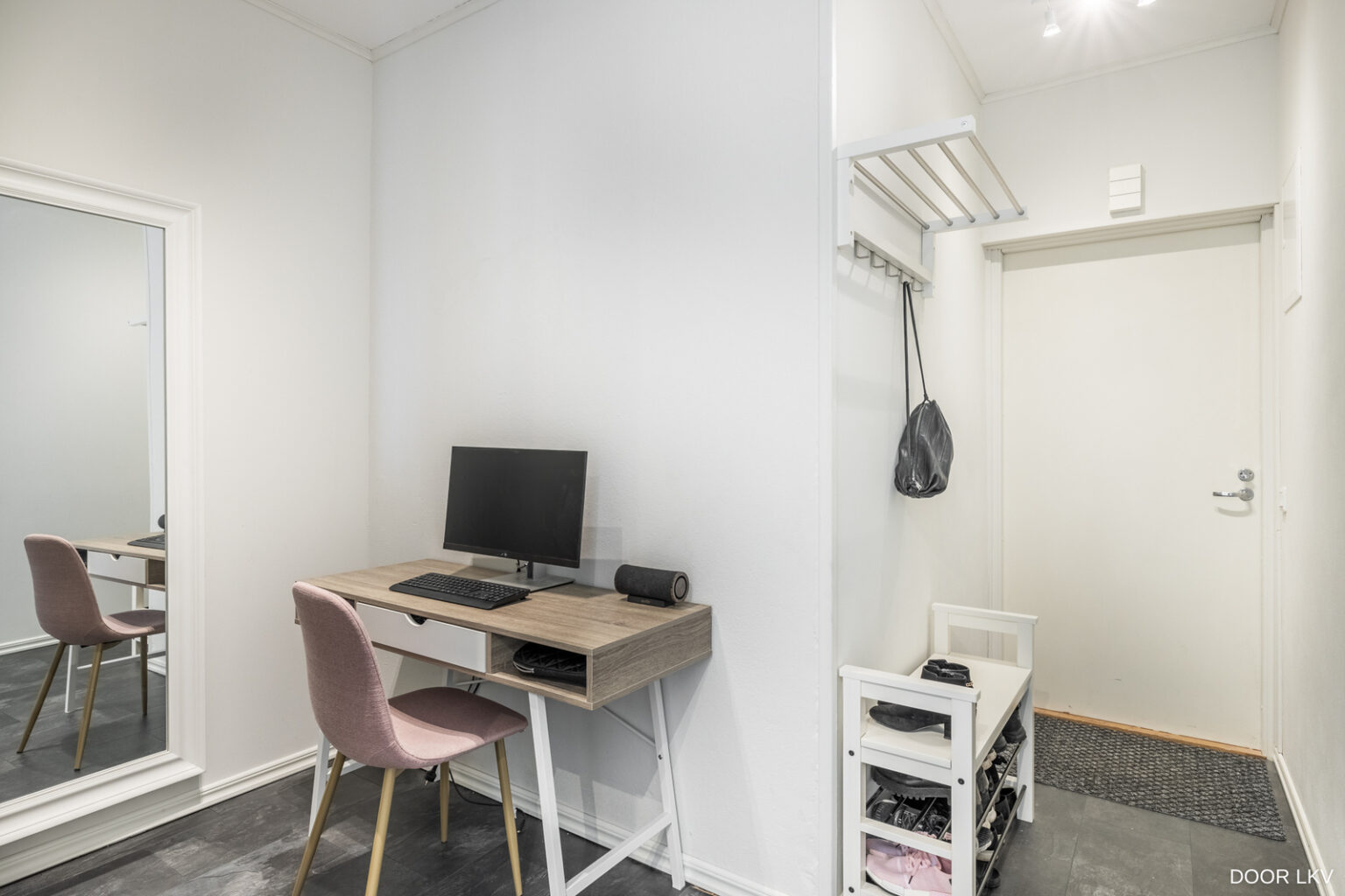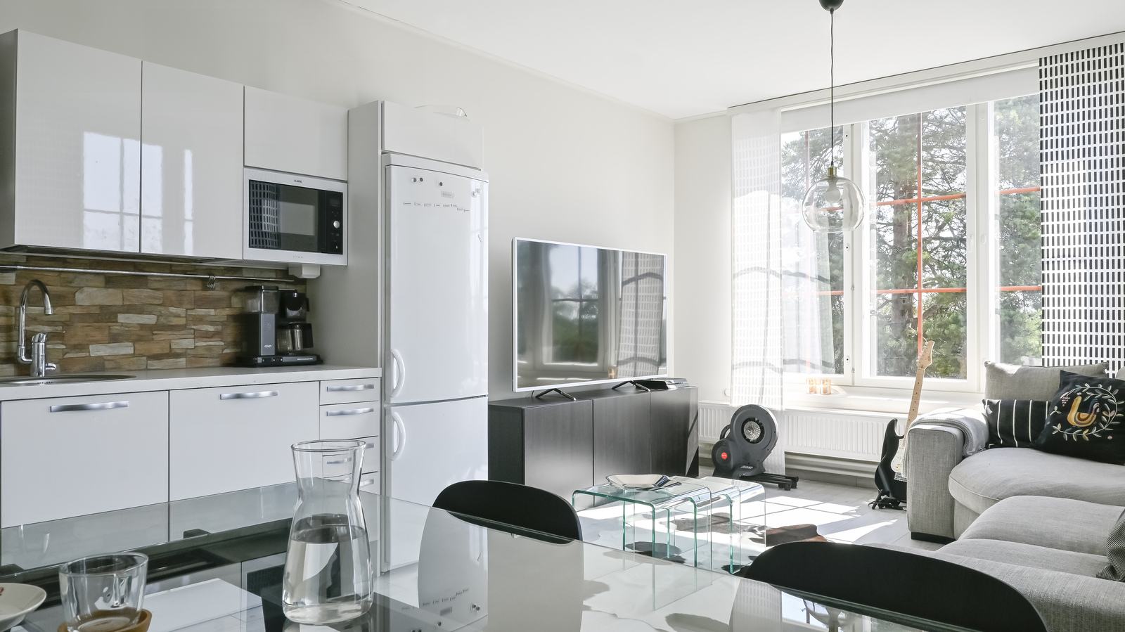 Avara keittiö ja olohuone muodostavat yhtenäisen, viihtyisän kokonaisuuden. Tilava makuuhuone, tyylikkäästi remontoitu kylpyhuone, oma sauna sekä eteistilan monikäyttöinen nurkkaus esimerkiksi työpisteelle viimeistelevät toimivan kokonaisuuden.