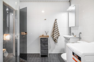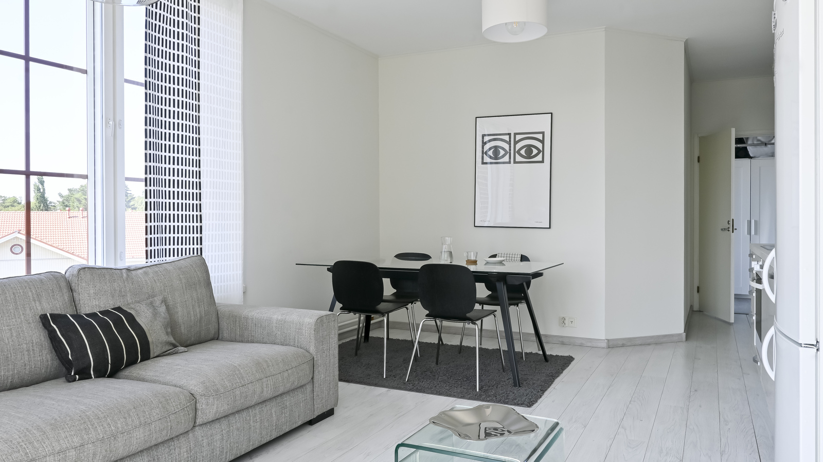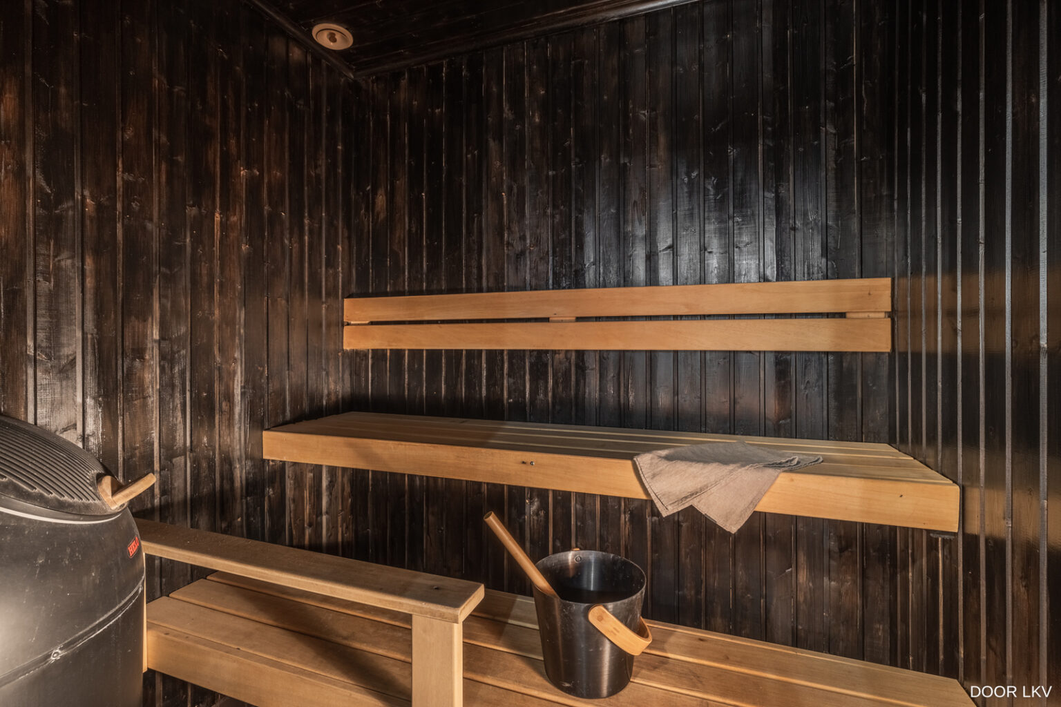 Det öppna köket och vardagsrummet bildar en harmonisk och trivsam helhet. Rymligt sovrum, stilfullt renoverat badrum, egen bastu samt praktisk hörna i hallen perfekt för hemmakontor eller förvaring fulländar bostadens funktionalitet.