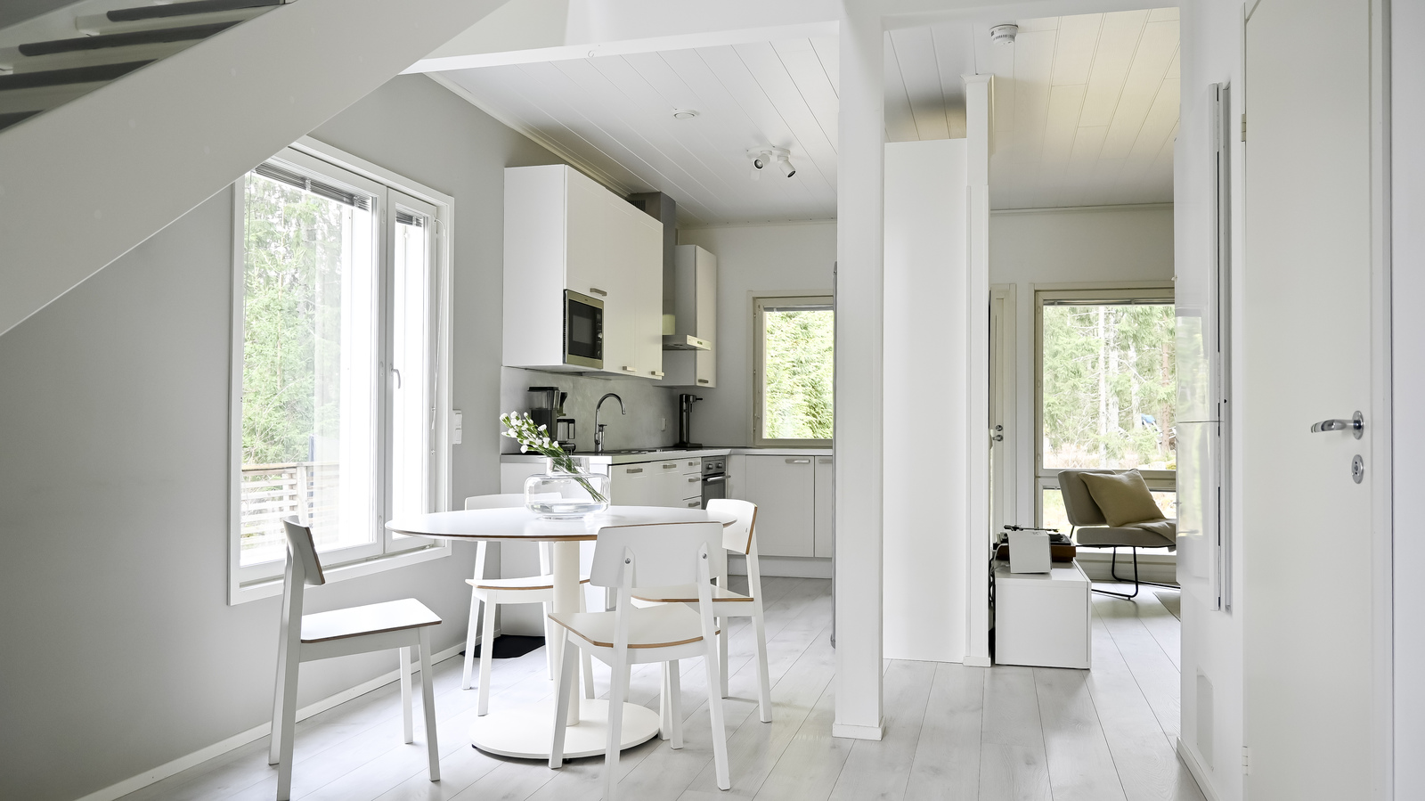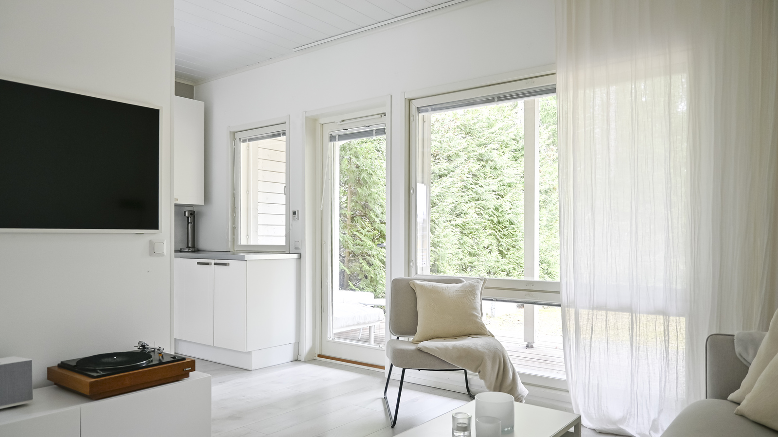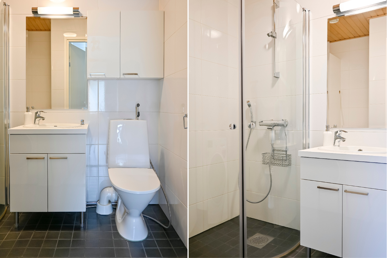 Asunnon sisäänkäynti avautuu tilavaan eteiseen, jossa on säilytystilaa sekä tilava kylpyhuone, jossa on wc, suihku ja sauna. Asuintilat muodostuvat valoisasta ja avoimesta kokonaisuudesta, jossa keittiö, ruokailutila ja olohuone yhdistyvät. Olohuoneesta on käynti isolle, aurinkoiselle terassille ja suojaisalle pihalle, jota ympäröi vehreä luonto – täydellinen paikka kesäiltojen grillailuun tai rauhallisiin kahvihetkiin.