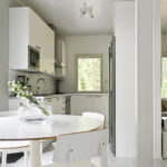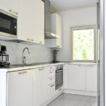 Bostadens entré bjuder in till en rymlig hall med förvaring samt ett väl tilltaget badrum med toalett, dusch och bastu. De sociala ytorna utgörs av ett ljust och öppet utrymme med kök, matplats och vardagsrum i anslutning till varandra. Från vardagsrummet når man den stora, soliga terrassen och den insynsskyddade gården med grönskande inramning – en perfekt plats för sommarens grillkvällar eller en kopp kaffe i lugn och ro.