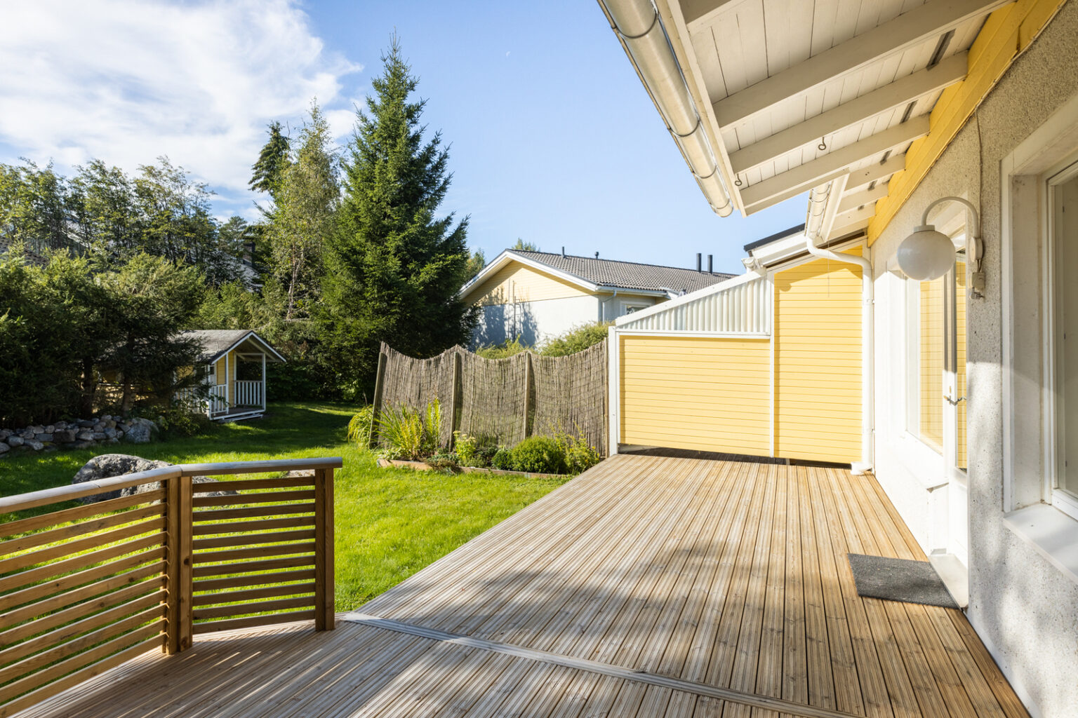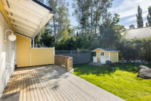 Bostaden erbjuder gott om förvaring i form av garderober och klädrum. Luftvärmepumpen håller värmekostnaderna låga vintertid och svalkar behagligt under sommaren. Den insynsskyddade trädgården vetter mot sydväst och bjuder på både gräsmatta och terrass, delvis under tak. Därtill finns uteförråd och garage som hör till bostaden.