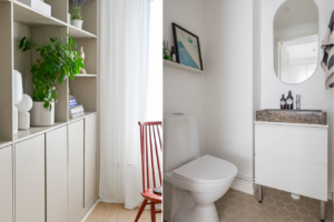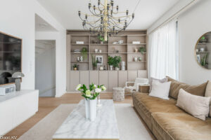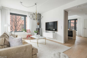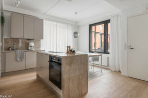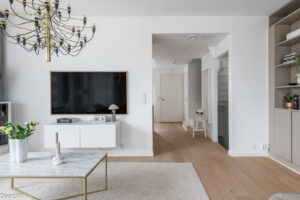 Mellanvåningen utgör hemmets hjärta. Vardagsrummet i gavelläge öppnar upp mot ljuset och utsikten över strandgatan och havet. En modern kamin och en stilren bokhyllslösning skapar värme och karaktär. Det skandinaviska köket med köksö och stenbänkskivor är både eleganta och funktionella, med direkt utgång till den skyddade terrassen mot husbolagets innergård.
