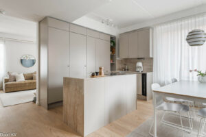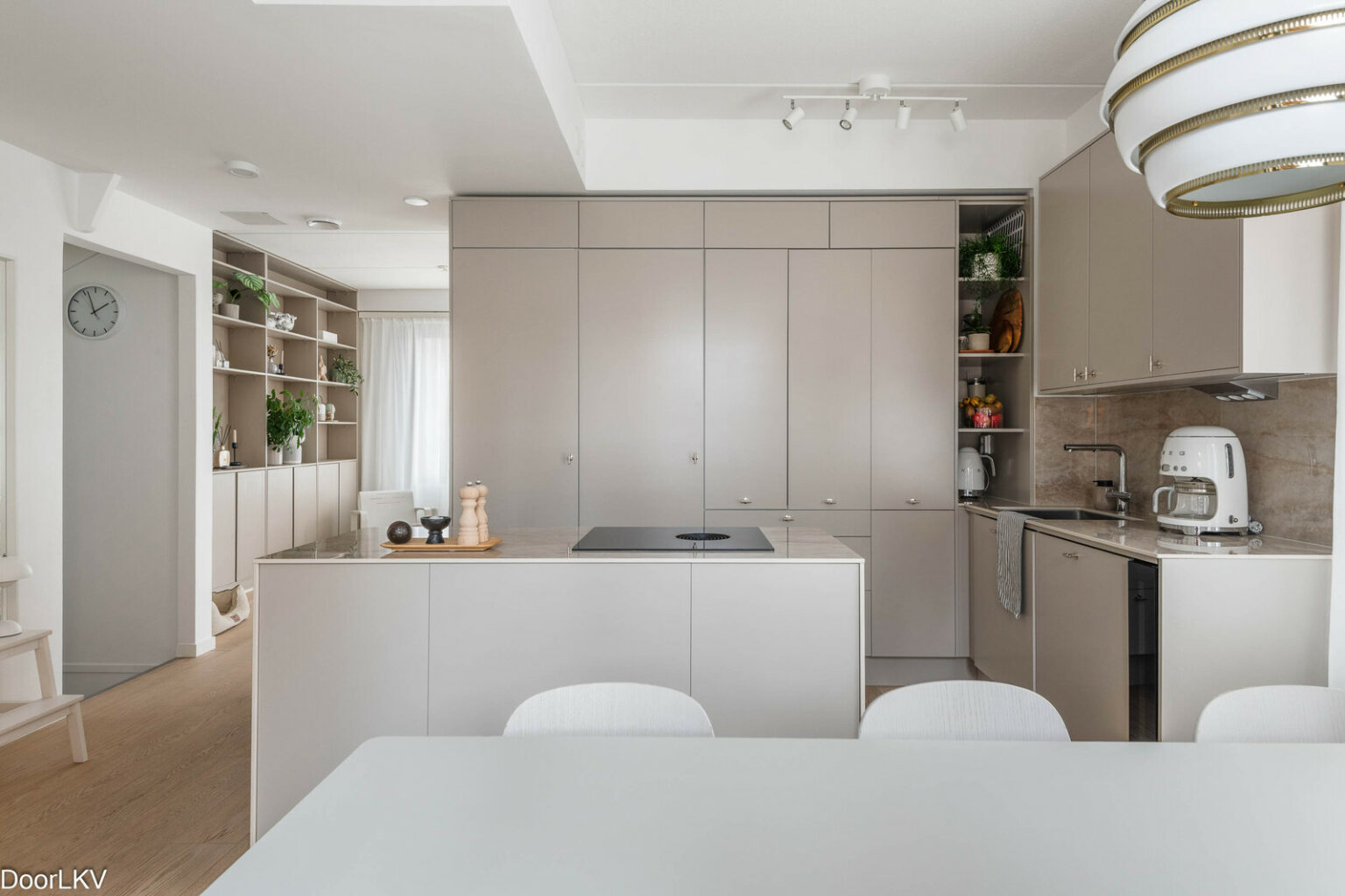 Keskikerros on kodin sydän. Kulmaan sijoittuva olohuone avautuu valoon ja näkymiin Rantakadun suuntaan sekä merelle. Moderni takka ja viimeistelty kirjahyllyratkaisu luovat tilaan lämpöä ja ilmettä. Skandinaavinen avokeittiö saarekkeineen ja kivitasoineen on sekä tyylikäs että toimiva, ja siitä on suora yhteys suojaisalle sisäpihan terassille.