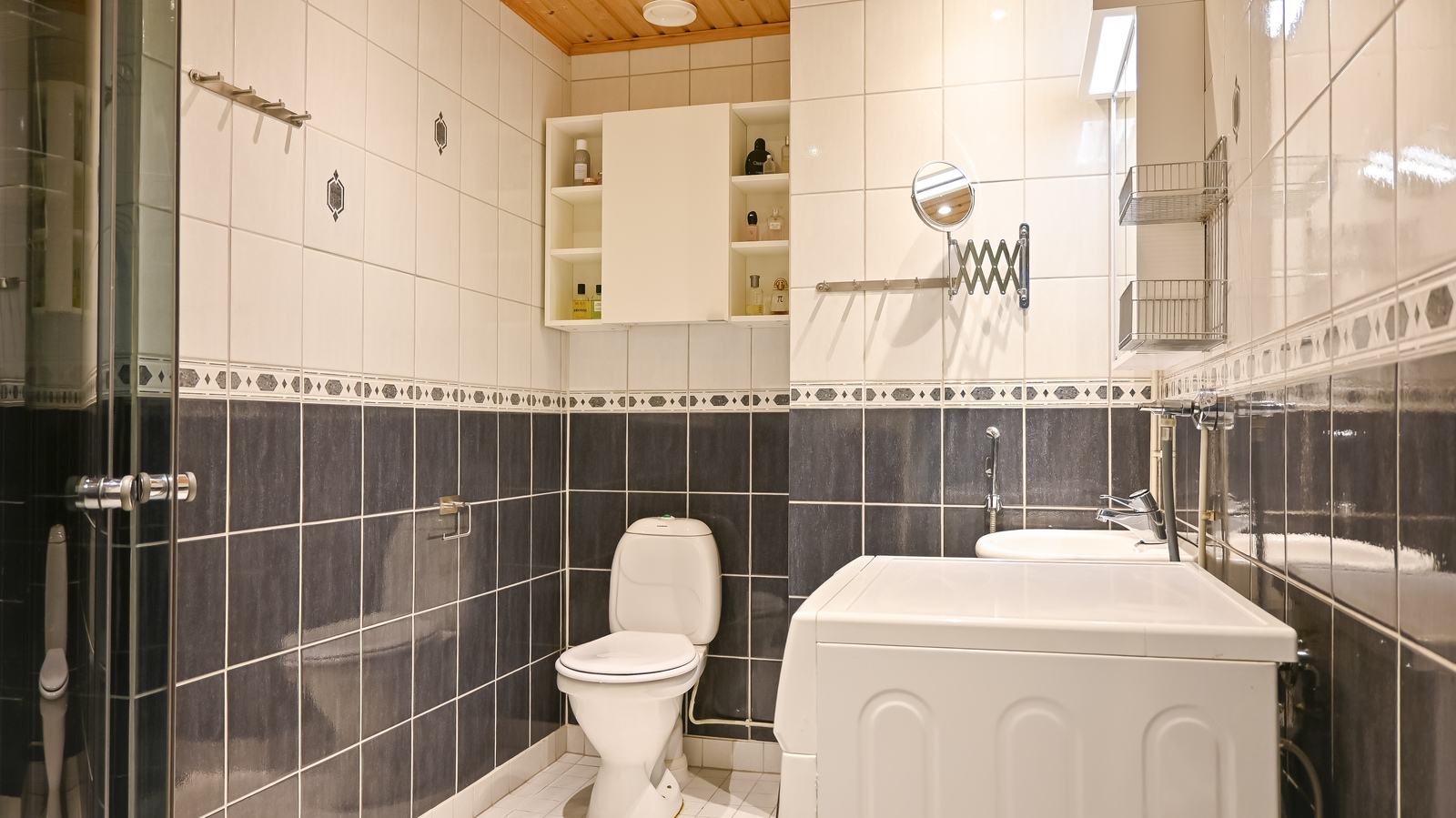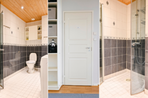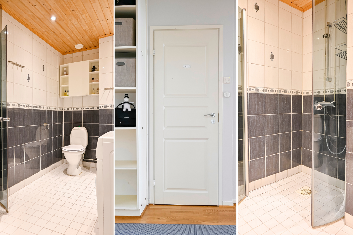 • Varusteet: suihkuseinä, pesukoneliitäntä, lattialämmitys, peilikaappi