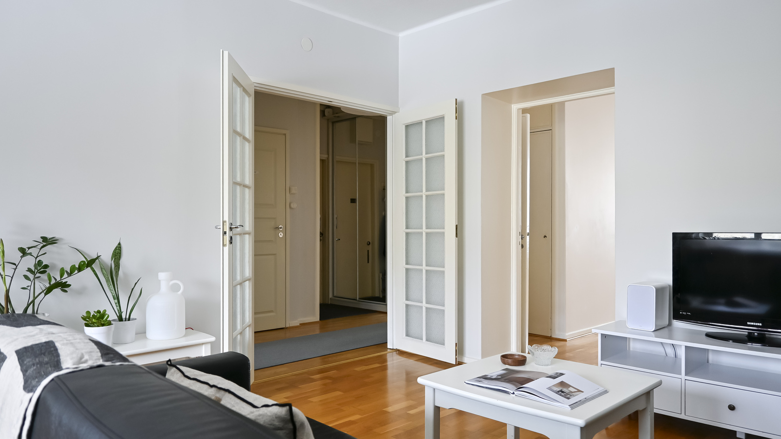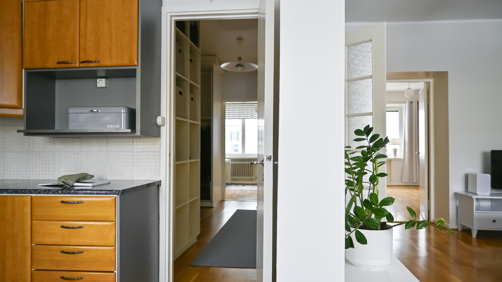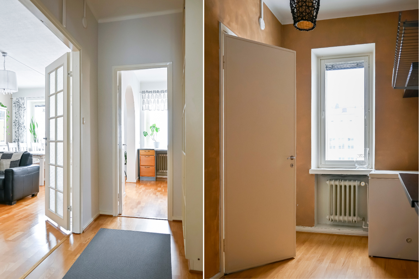 Asunnossa on kaksi makuuhuonetta, joista toinen on erittäin tilava ja varustettu vaatekaapilla. Sekä eteinen että käytävä ovat tilavia ja niissä on kaapit ja hyllyt, jotka sisältyvät kauppaan. Koko asunnossa on miellyttävä parkettilattia. Taloyhtiö on hyvin hoidettu ja suuria remontteja on tehty.