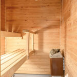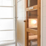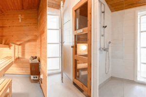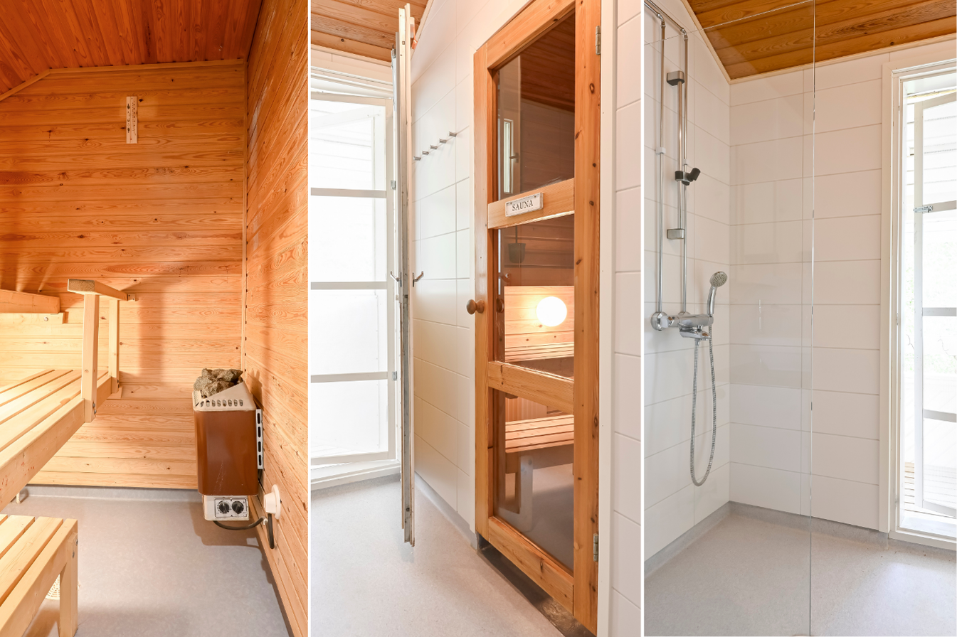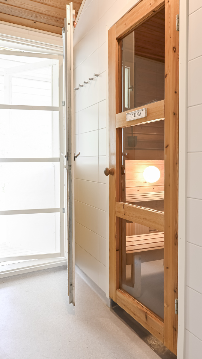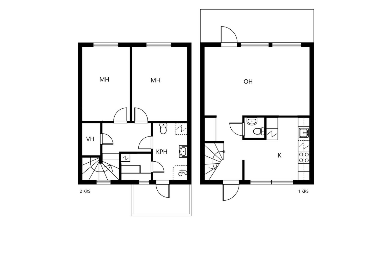Alakerrassa sijaitsevat keittiö, valoisa olohuone sekä erillinen wc. Yläkerrasta löytyvät kaksi makuuhuonetta, kylpyhuone sekä oma sauna.