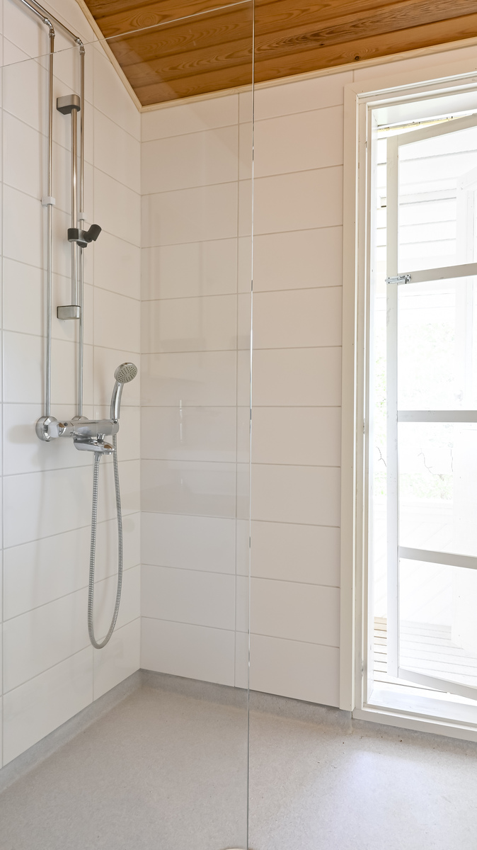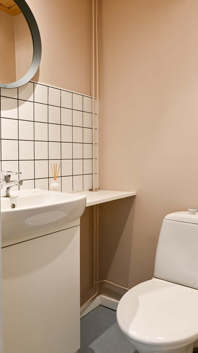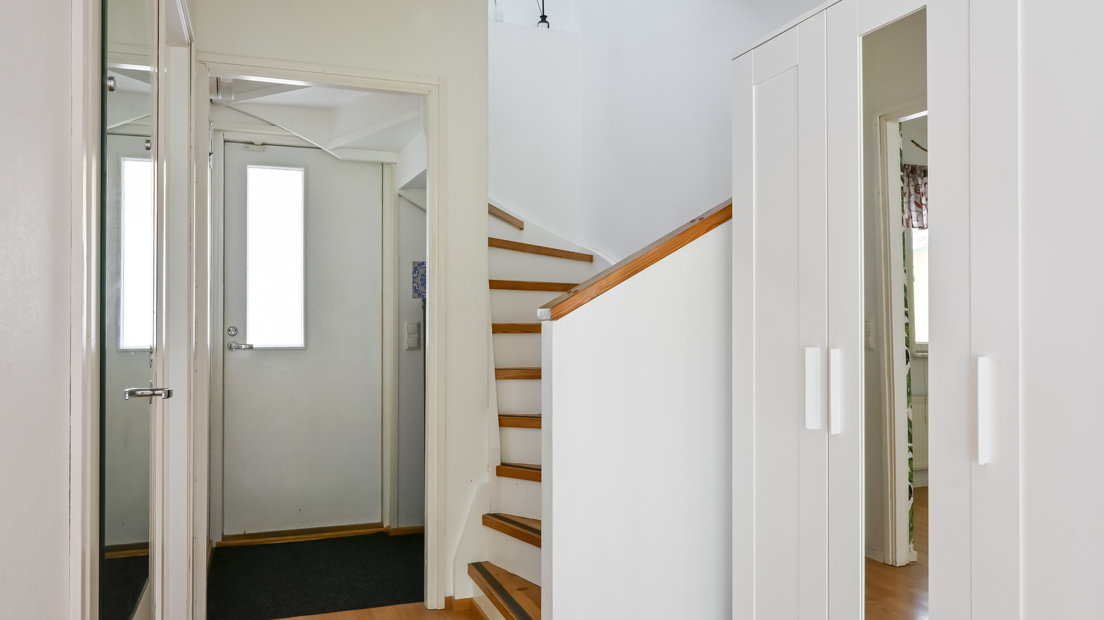 På nedre plan finns kök, ett ljust vardagsrum samt separat toalett. På övre våningen finns två sovrum samt egen bastu.