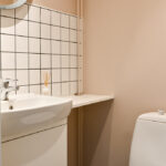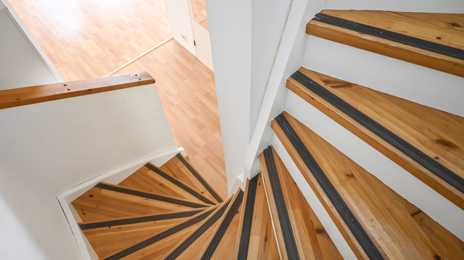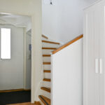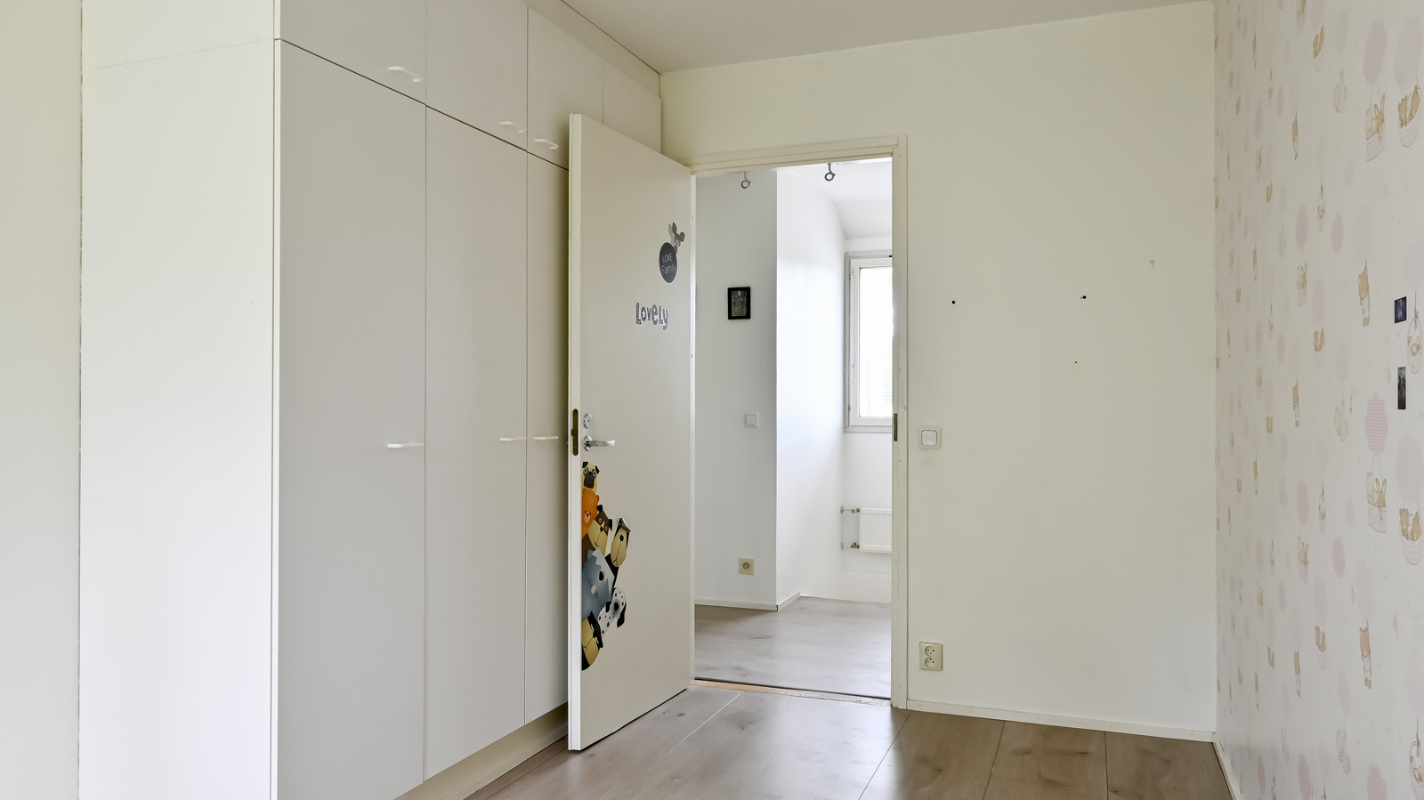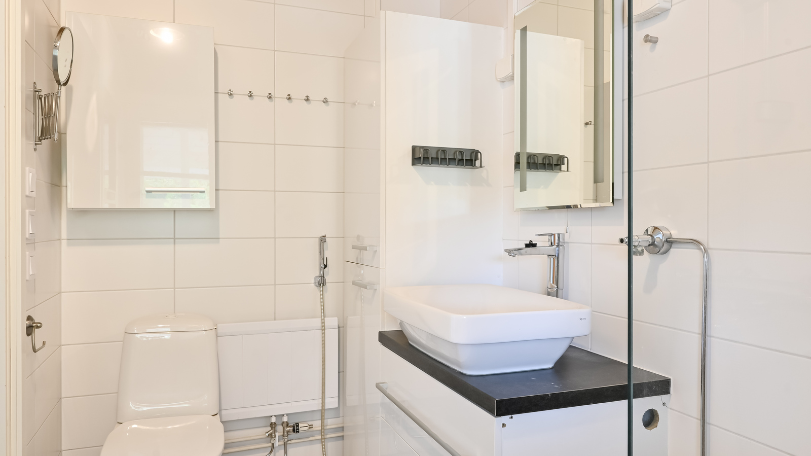 På nedre plan finns kök, ett ljust vardagsrum samt separat toalett. På övre våningen finns två sovrum samt egen bastu.