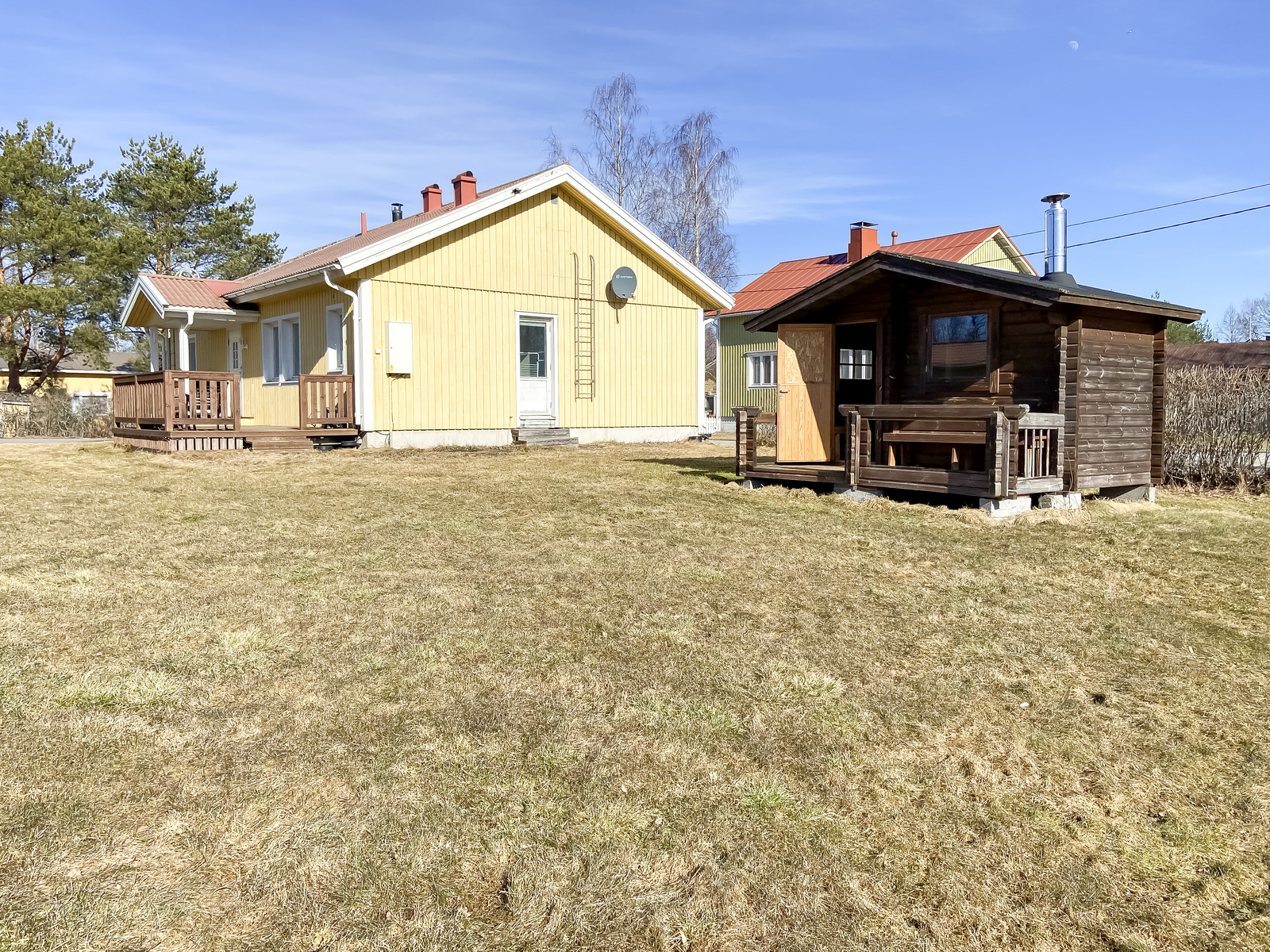 | Lisätietoja pinta-alasta | Asuinrakennuksen huoneistoala on rakennuspiirustuksien mukaan 101,5 m² ja kerrosala 112,4 m². Talousrakennusten pinta-ala on rakennuspiirustuksien mukaan 36,5 m² ja pihasauna 8,5 m². Näidän lisäksi löytyy myös pihavaja. Bostadsbyggnadens lägenhetsyta är enligt byggnadsritningarna 101,5 m² och våningsytan 112,4 m². Ekonomibyggnadens yta är enligt ritningarna 36,5 m² och gårdsbastun 8,5 m². Utöver dessa finns även ett gårdsskjul. |
