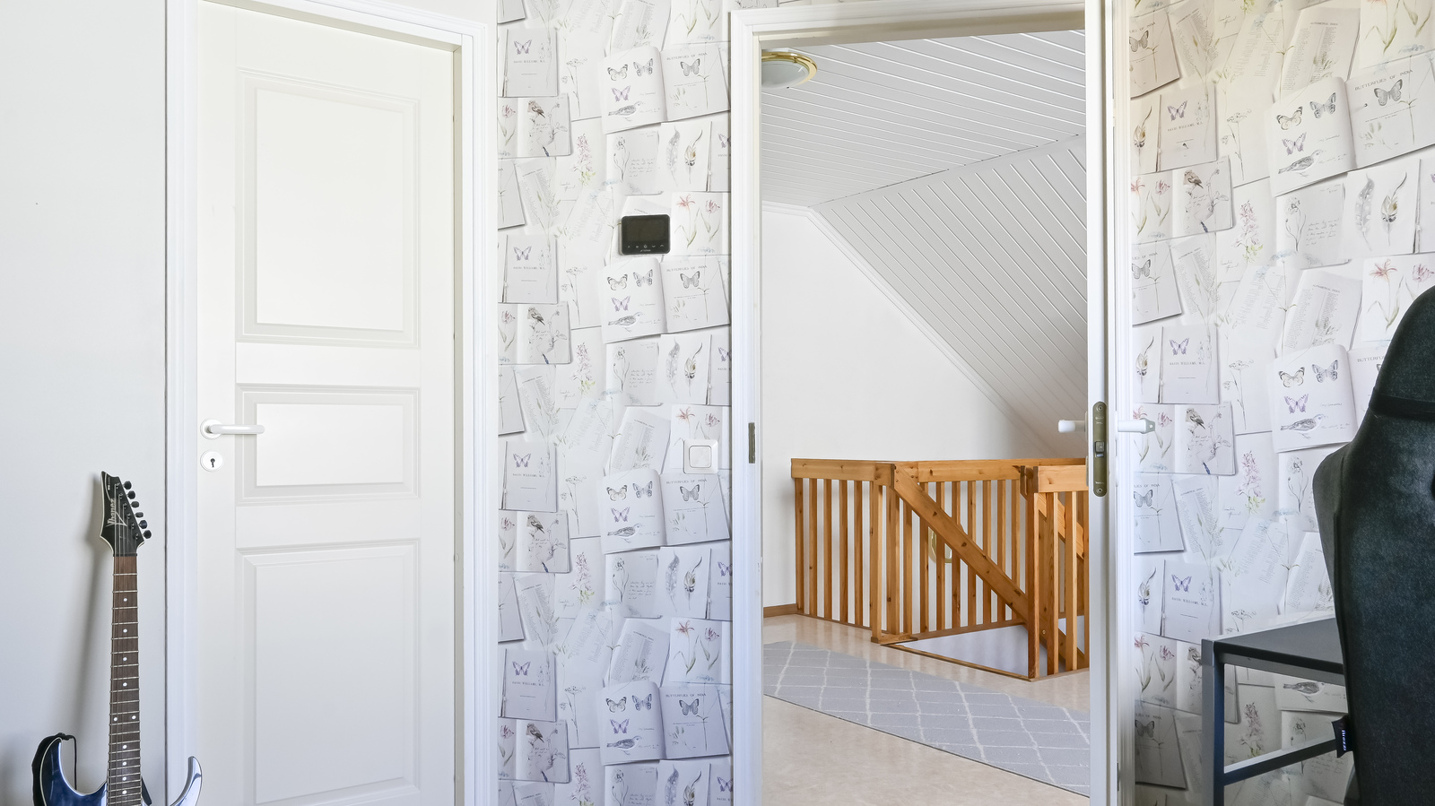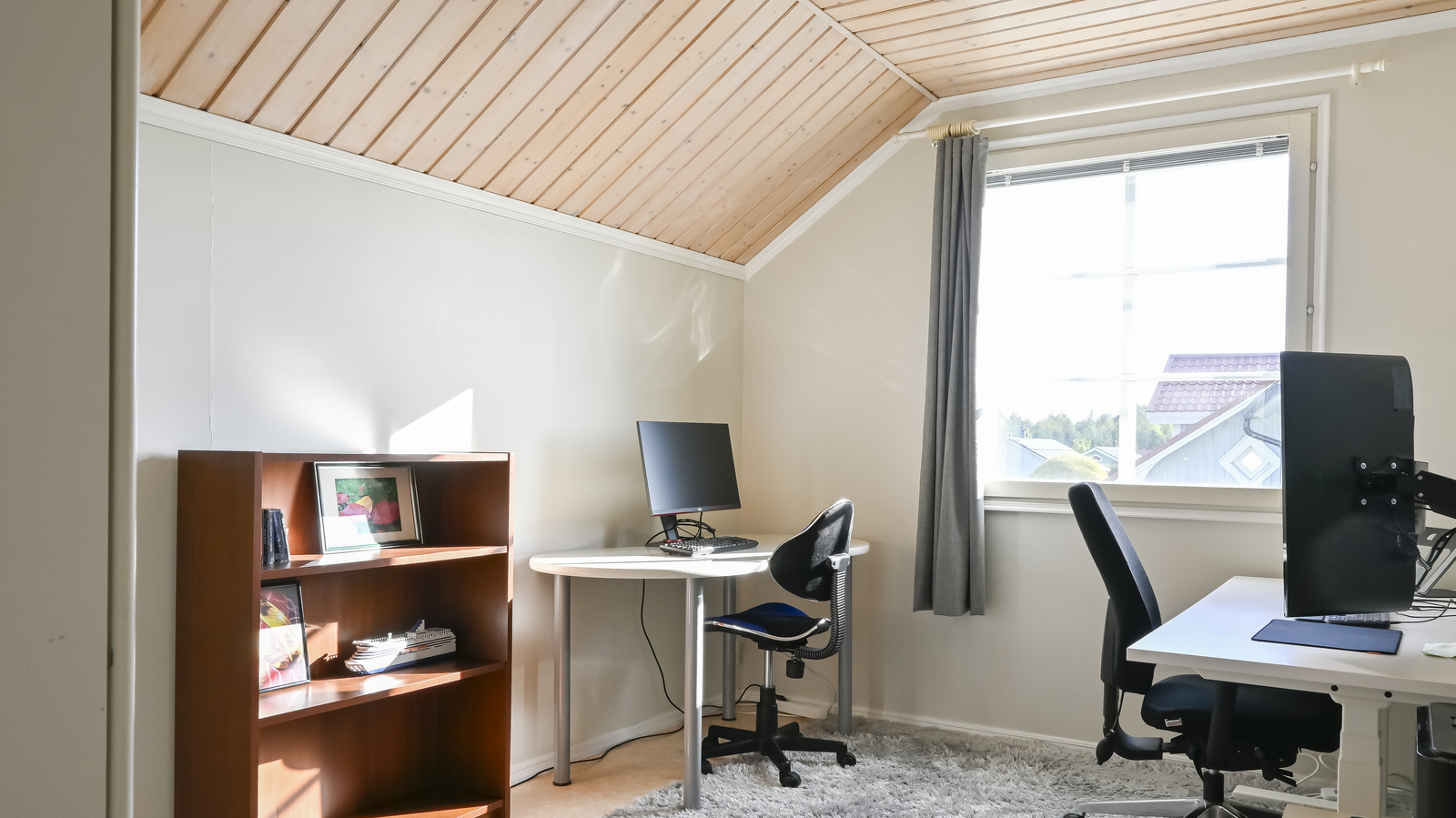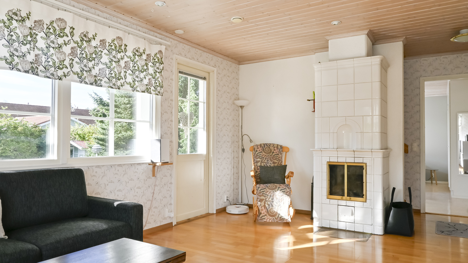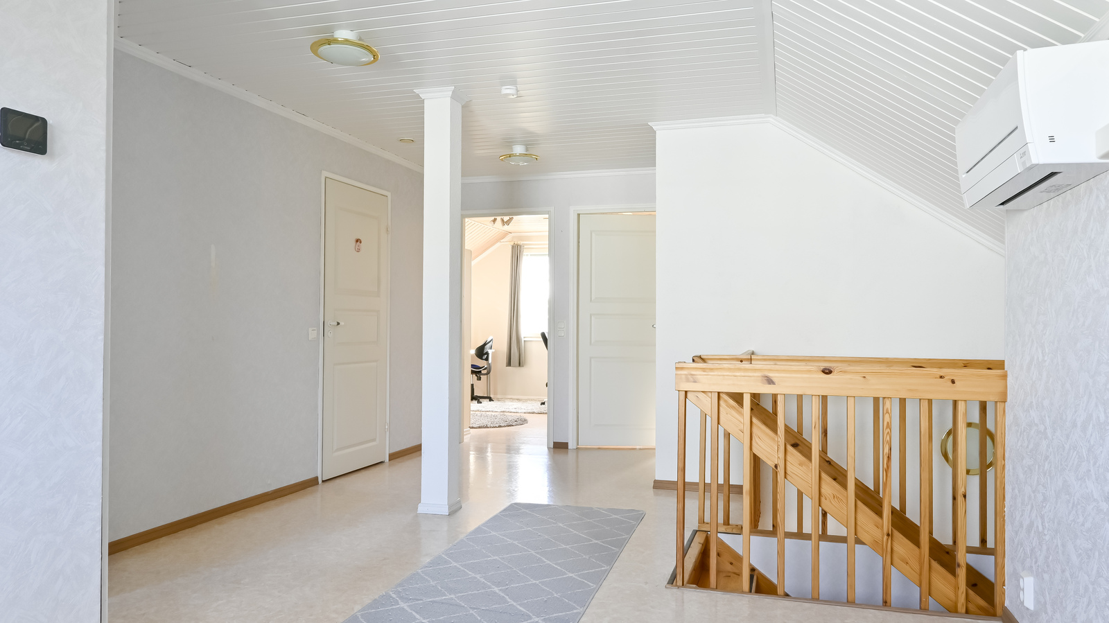 I nedre våningen finns ett ljust vardagsrum, separat sovrum och praktiskt kök samt rymlig groventré/tvättstuga dessutom finns en bastuavdelning och separat wc. I övre våningen finns tre sovrum, samt en praktisk hall, två klädrum och ett badrum som gör vardagen smidig och bekväm.